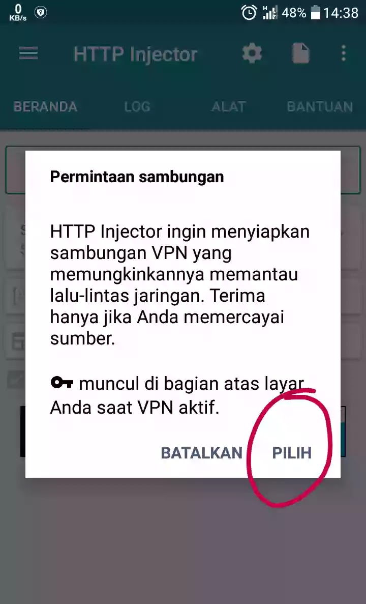 Bila sudah tekan kembali pada beranda http injector lalu klik mulai bila ada pop up seperti gambar dibawah klik pilih saja.